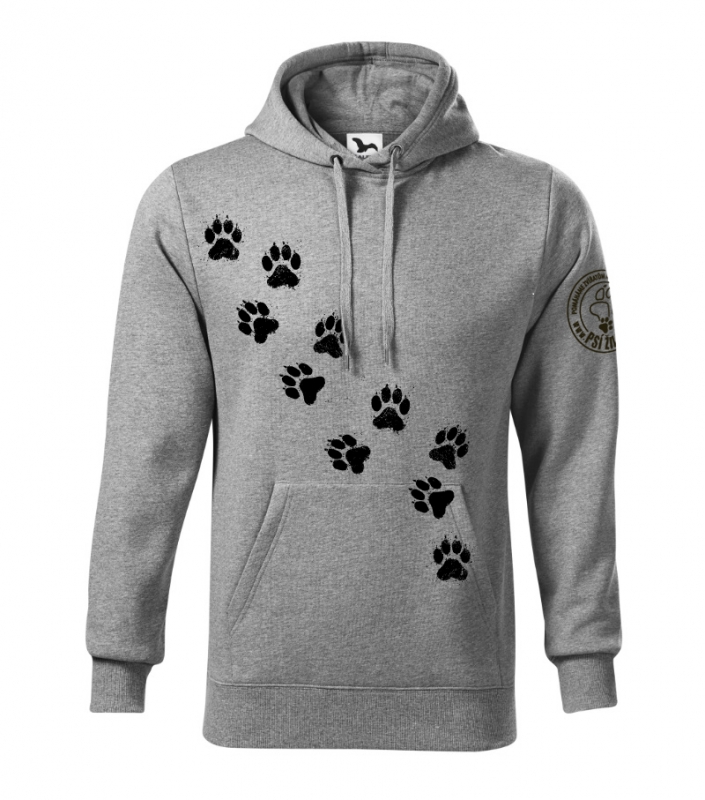 Mikina s kapucí, tmavě šedý melír značky Malfini, typ Cape. Velmi příjemná na nošení, měkká, pohodlná. Kromě tlapek na přední straně mikiny, je na levém rameni mikina potištěná kulatým logem Psího života.